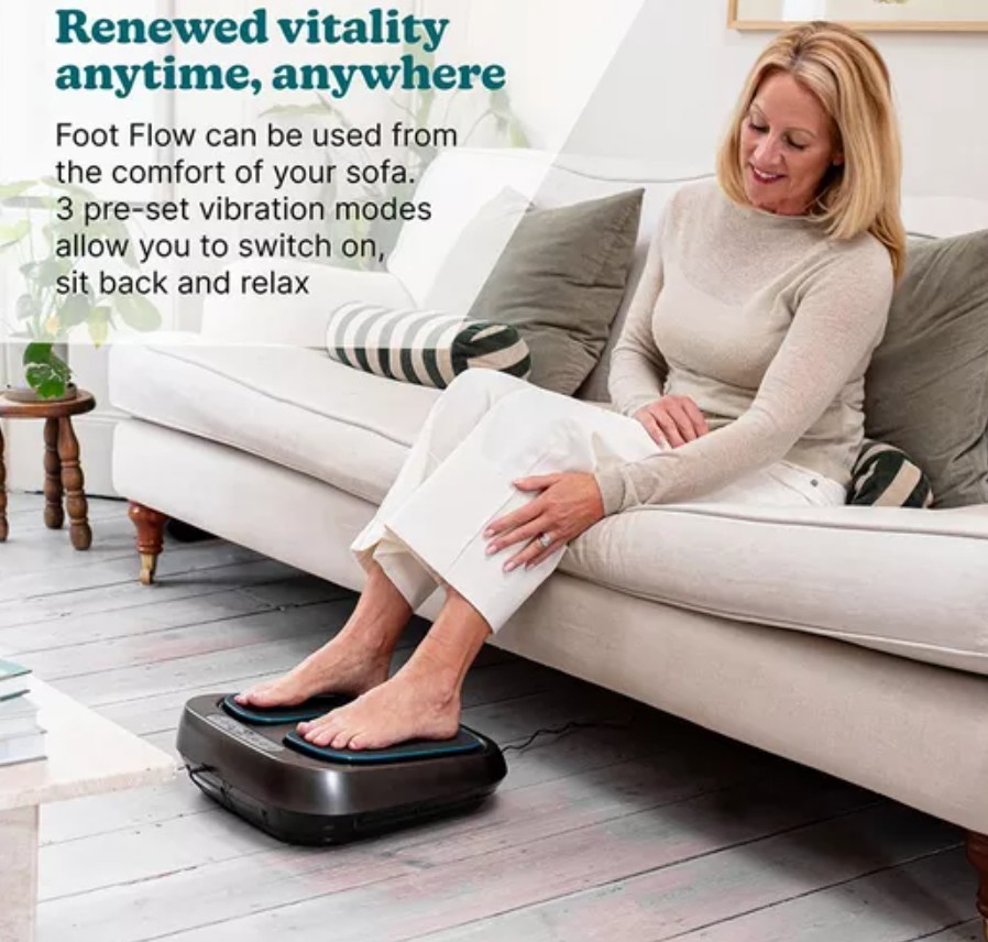 Vibrating foot massager with 10 speeds, dual heat, 3 preset programs, and remote control.