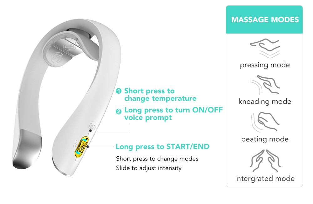 Rechargeable neck massager with four modes: pressing, kneading, tapping, and comprehensive.