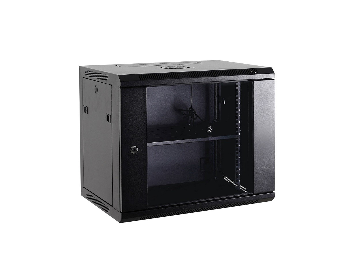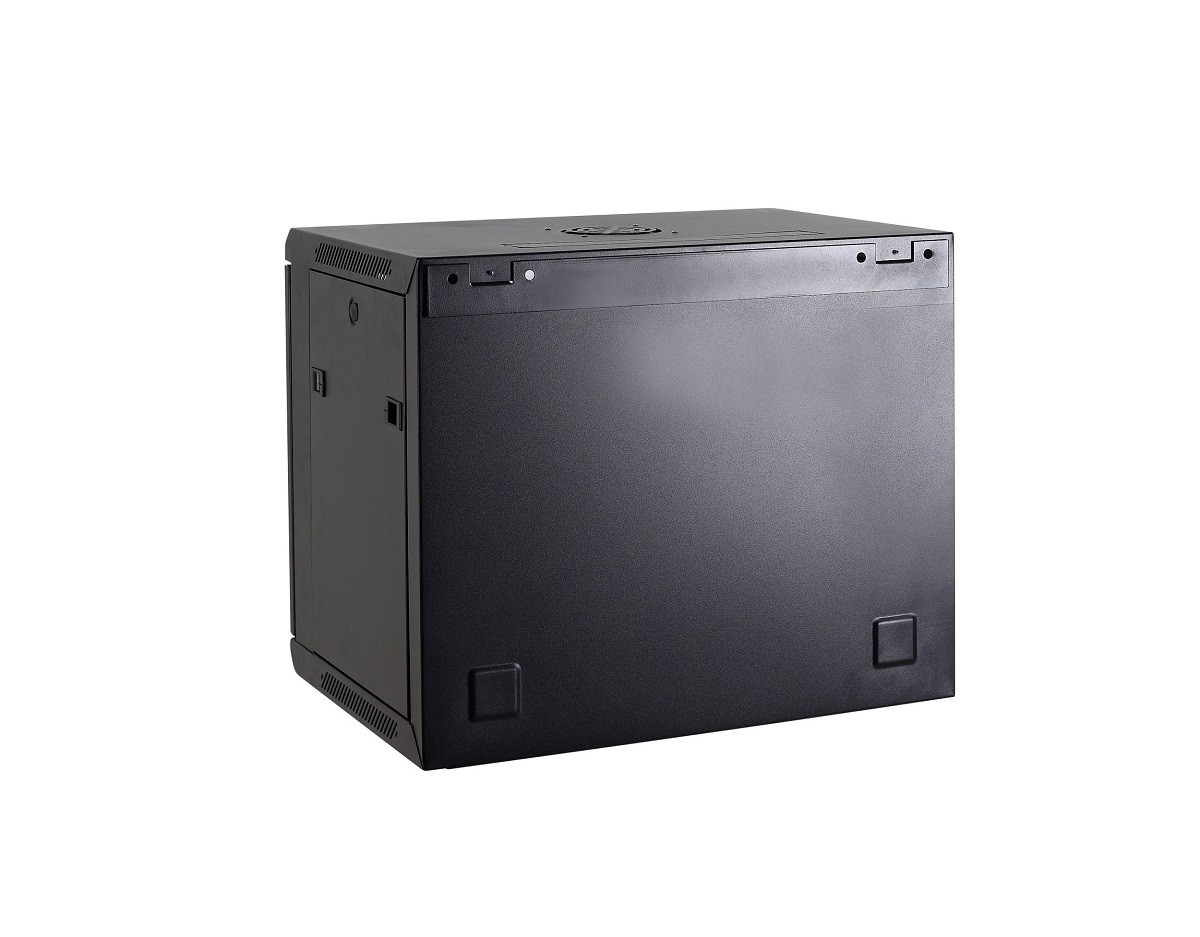 15U, 19'' wall mount cabinet, 450 mm depth, 60 cm width; 5 mm tempered glass front with 180° swing, removable side panel, top/bottom cable entry, Not Assembled.