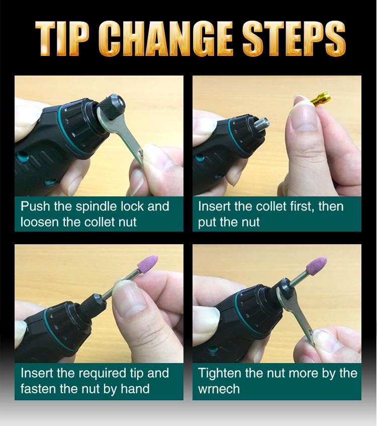- Accessory :USB cord, Wrench, Ø2.4 mm collet , Ø 3.2 mm collet (Assembled in body), Mandrel for sanding band, Mandrel for cutting wheel,8pcs bits assortment