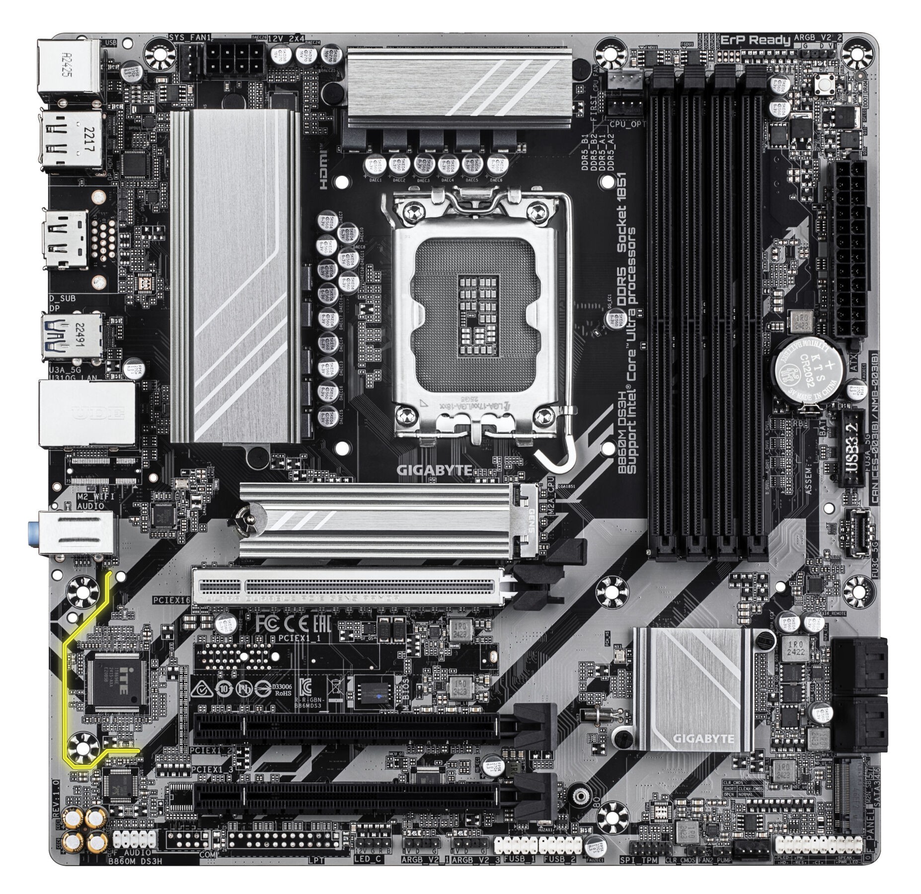 GIGABYTE B860M DS3H Motherboard - Intel Core Ultra Series CPUs. 5+1+2+1 Phases VRM. up to 9066MHz DDR5. 1xPCIe 5.0 + 1xPCIe 4.0 M.2. 2.5GbE LAN. USB 3.2 Gen 2. Processor manufacturer: Intel. Processor socket: LGA 1851 (Socket V1). Compatible processor series: Intel® Core™ Ultra (Series 1). Intel Core Ultra (Series 2). Supported memory types: DDR5-SDRAM. Maximum internal memory: 256 GB. Memory slots type: DIMM. Supported storage drive interfaces: M.2. SATA III. Supported storage drive types: HDD & SSD. RAID levels: 0. 1. 5. 10. Maximum resolution: 4096 x 2160 pixels. Ethernet interface type: 2.5 Gigabit Ethernet. LAN controller: Realtek RTL8125