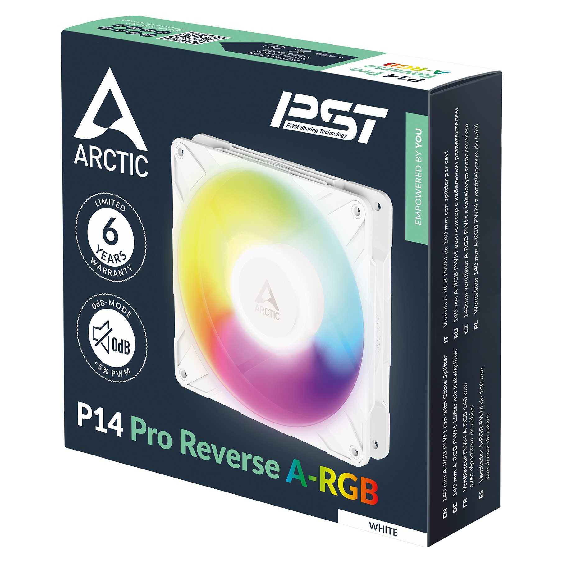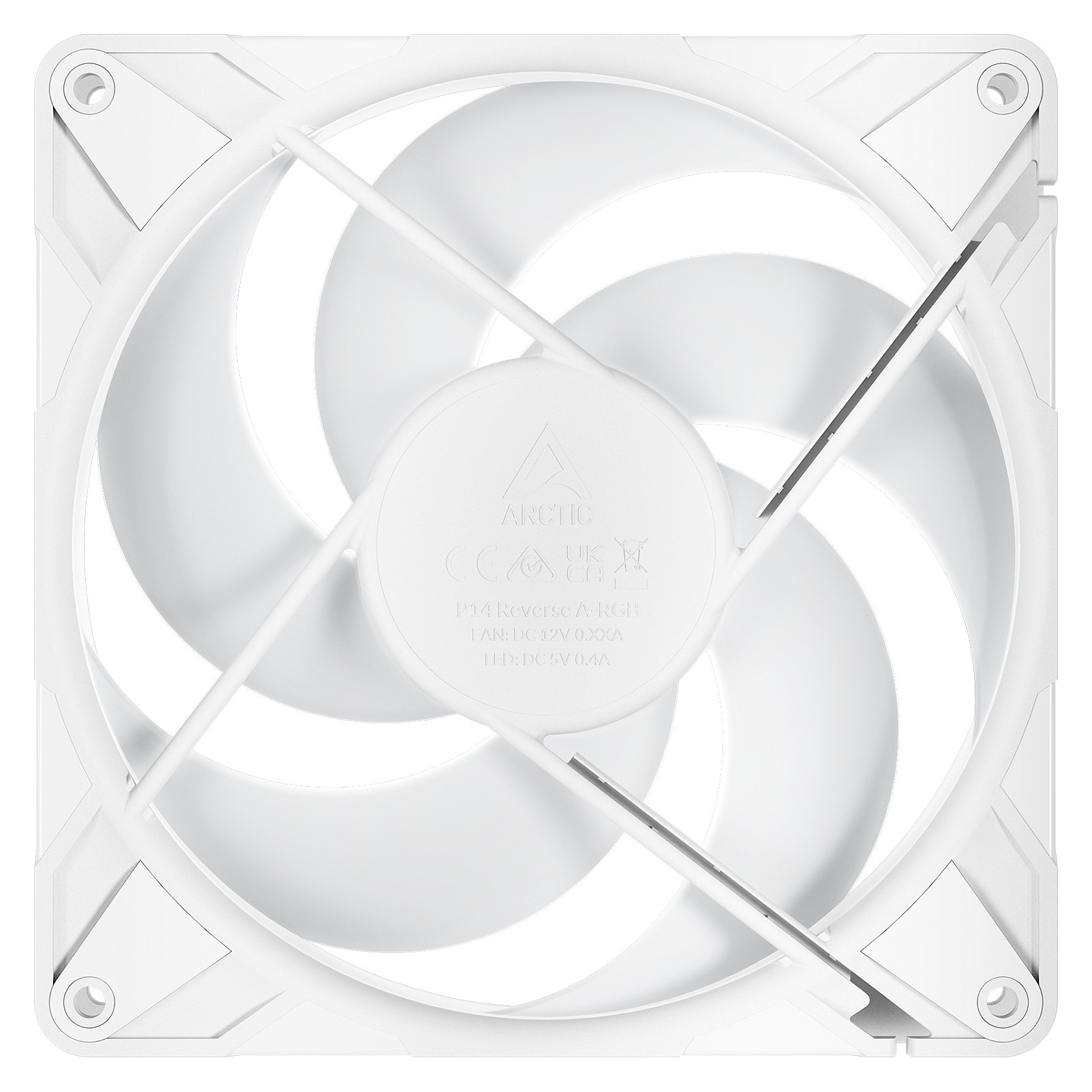 ARCTIC Freezer P14 Pro Reverse A-RGB (White) - 3 Pack - 140 mm A-RGB PWM-Lüfter mit Kabelsplitter. Typ: Ventilator. Lüfterdurchmesser: 14 cm. Luftstrom: 166.5 m³/h. Maximum Luftdruck: 5.1 mmH2O. Lagertyp: Fluiddynamisches Lager (FDB). Produktfarbe: Weiß