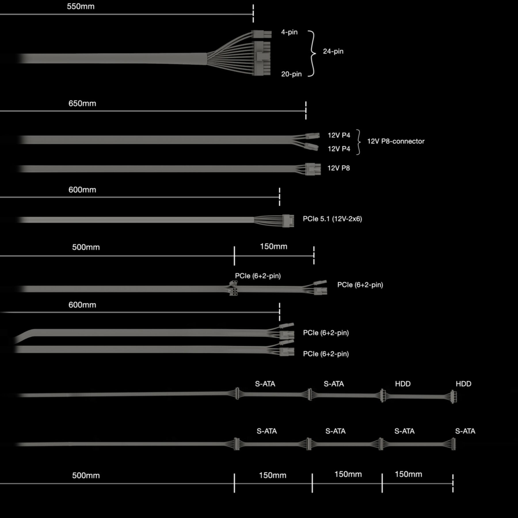 | SATA power cable length | 500, 650, 800, 950 mm |