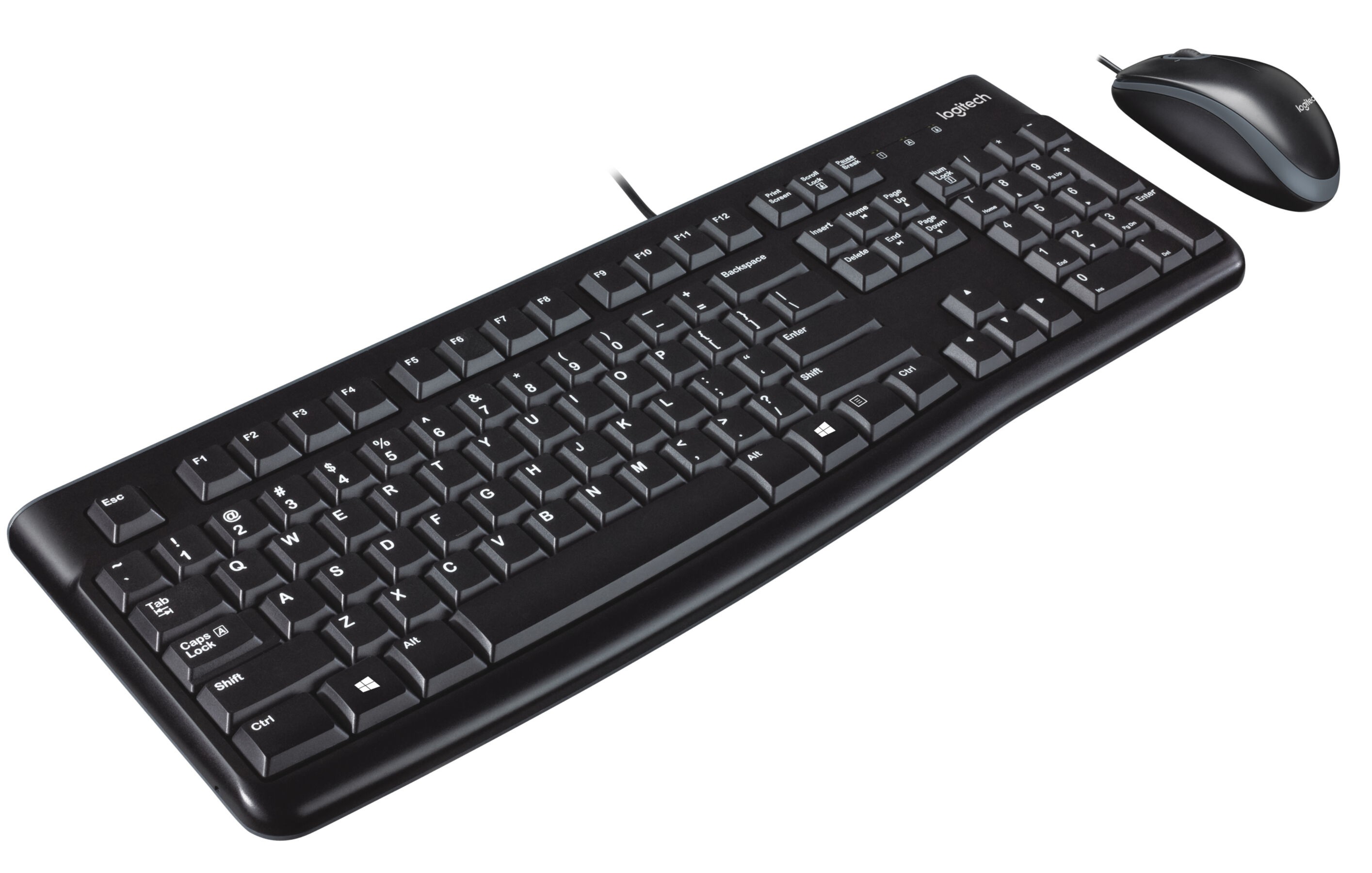 Wired Logitech MK120 combo: full-size USB keyboard (US layout), spill-resistant, 10M keystroke life; optical mouse 1000 DPI, 3 buttons. Reliable plug-and-play for PC.